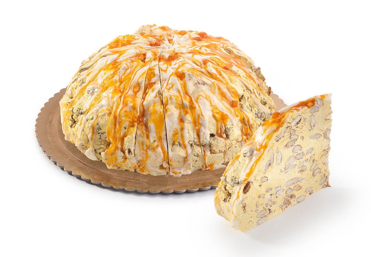 Ingredienser: Sukker, MANDLER, glukosesirup, honning, citronmasse 2% (glukosesirup, sukker, vand, aroma, citronsaft, surhedsregulerende middel: E331, stabilisator: E407, antioxidant: L-ascorbinsyre), ÆGGEHVIDE, hvid glasur (raffineret vegetabilsk olie og fedt (palmekerne, kokos, shorea smør, solsikke, palme, raps), sukker, SKUMMETMÆLKSPULVER, VALLEPULVER, SOJALECITHIN, aroma, kakaopulver), appelsinmasse (appelsinsaft, glukosesirup, citronsyre, vegetabilsk koncentrat (gulerod, radise, æble, solbær, græskar), stabilisator: E440, naturlig aroma, surhedsregulerende middel: E331, antioxidant: L-ascorbinsyre), kandiseret appelsin (appelsinskal, glukose-fruktose sirup, sukrose, citronsyre, konserveringsmiddel: E220), glukosesirup, naturlig orange farve, (radisesaft, saflorekstrakt, naturlig aroma), aroma), Limoncello dekoration (sukker, vand, glukosesirup, aroma, citronsyre, stabilisator: E406, E440, surhedsregulerende middel: E331, antioxidant: L-ascorbinsyre, farvestof: E100), kandiseret citron, (citron, glukose-fruktose sirup, sukrose, surhedsregulerende middel: E330, konserveringsmiddel: E220), geleringsmiddel (pektin, natriumalginat, dextrose), pulveriseret citron, aroma, vaffelpapir (kartoffelmel, vand, solsikkeolie). Kan indeholde spor af andre nødder og jordnødder. GLUTENFRI. EGNET FOR VEGETARER
