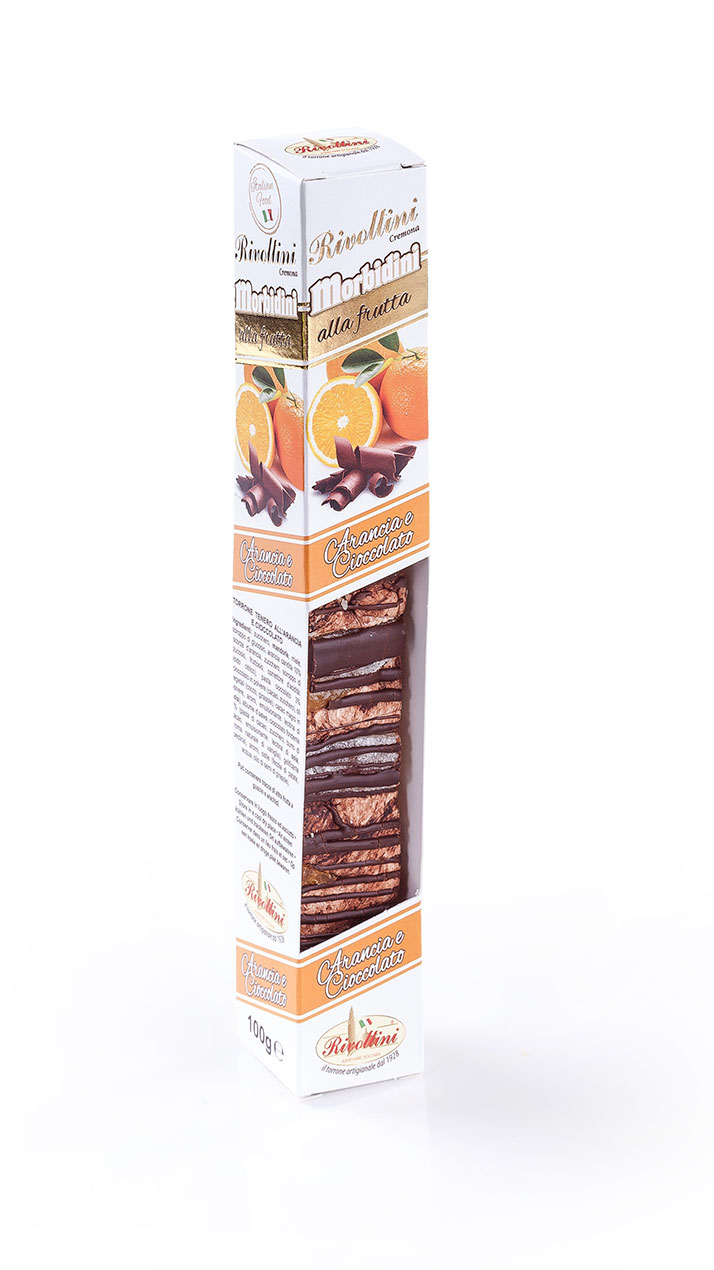 Cremet italiensk torronebar i flot indpakning. Også kendt som "hvid nougat" eller "fransk nougat" og her tilsat appelsin og chokolade efter italiensk opskrift.
